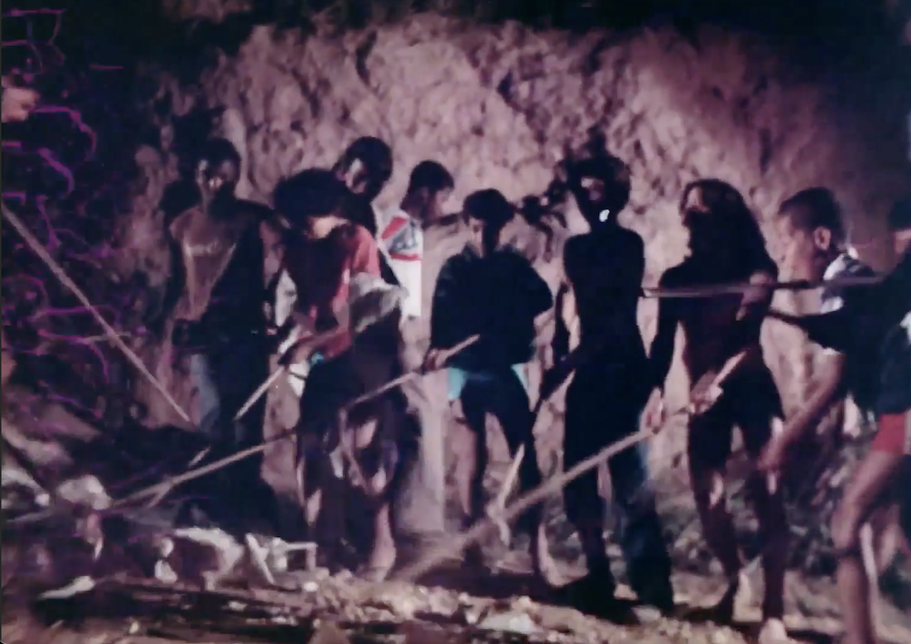 The “suspense” referred to by the censors is itself one of the procedures Sampaio uses to prolong the film’s main point of deception. Darkness, distorted sounds, and almost ritualistic gestures occur in the preparation of the stiff/doll:3 the film curiously explores death (or rather, the possibility of its suggestion) in a darkly enchanting way. But the policeman’s self-proclaimed “authority” clashes with the possibility of this macabre humor, allowing little room for discovery and even less space for what the film embraces as complex or contradictory: the “malhação”.4 Referring to the act of a dozen children tearing apart the Judas doll with sticks and then setting it on fire, the malhação is as wild as it is fun. The film displays a threshold for the staging of child violence less related to “trauma” (as announced in the censorship card), but more so to catharsis.