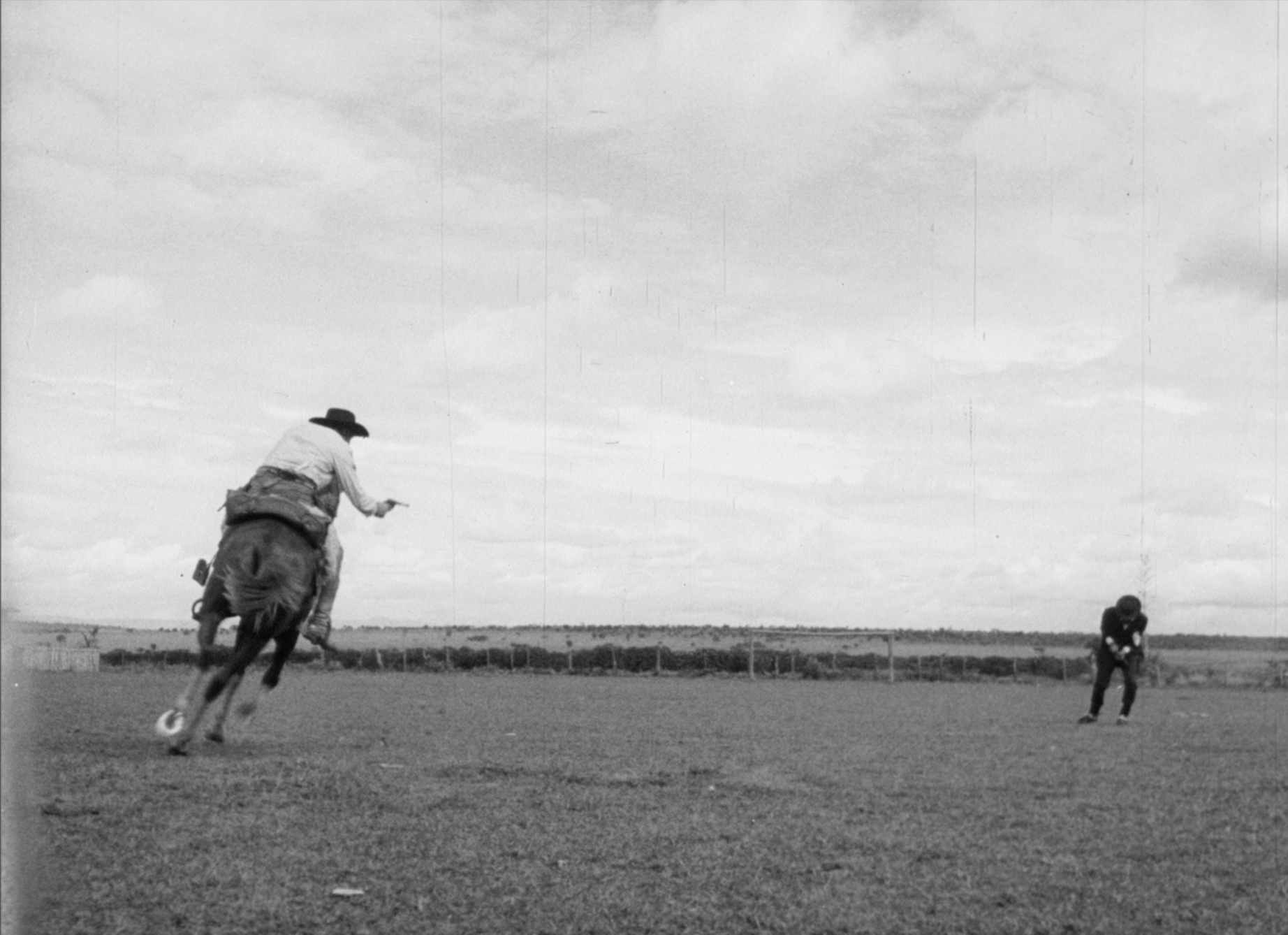 This tradition is a useful reference point to My Name is Tonho, since Candeias completely dismisses it. Brazilian westerns often work hard to create Brazilian myths out of recognizable genre beats. Candeias does the same, but he forges his own path that has only some resemblance to genre as we know it (Fordian mythmaking couldn’t be further from his interests). Tonho certainly has known genre motifs - a family massacre, a man after revenge, a gang that terrorizes the region, and it even ends with a duel payoff between the avenging hero and the violent bandit. However, almost nothing about how it plays follows expectations. Candeias approached Tonho not as a reconstructed American genre film, but as a countryside drama. In this, it is actually closer to a John Ford/Harry Carey silent western, imagining situations that were still recognizable to a local population instead of what the post war western would become, where familiarity with people and situations matter more than narrative motifs. Tonho replaces the American old west for São Paulo country life. Its main interests are life and rhythms of small towns and farms of the area. Sometimes a shootout or a fistfight will break out, but it is telling that so much of it concerns people simply riding horses.