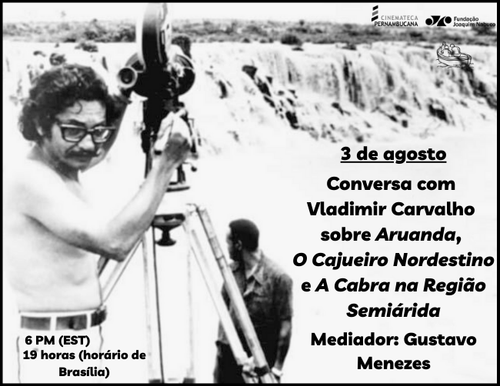 On August 3, 2021, we hosted a virtual conversation with filmmaker Vladimir Carvalho, moderated by Gustavo Menezes, revisiting key moments in the history of Brazilian documentary through three central works in his career. Starting from his involvement in the production of Aruanda (1960), Carvalho discussed the film’s making, creative decisions, and historical context, expanding the conversation to O Cajueiro Nordestino and A Cabra na Região Semiárida—films that closely link cinema, territory, and memory in Brazil’s Northeast. The event took place at 7:00 pm (Brasília time) and was broadcast live.